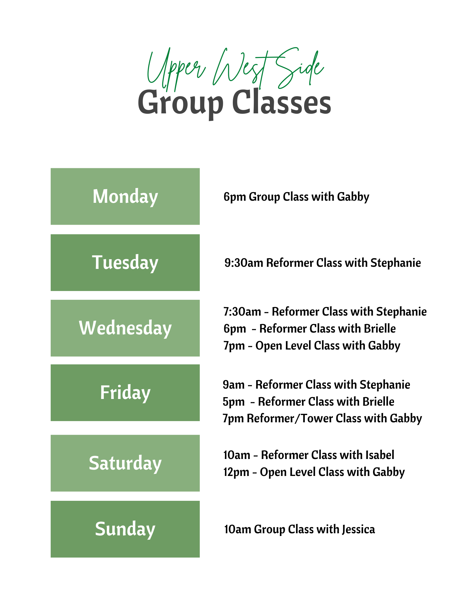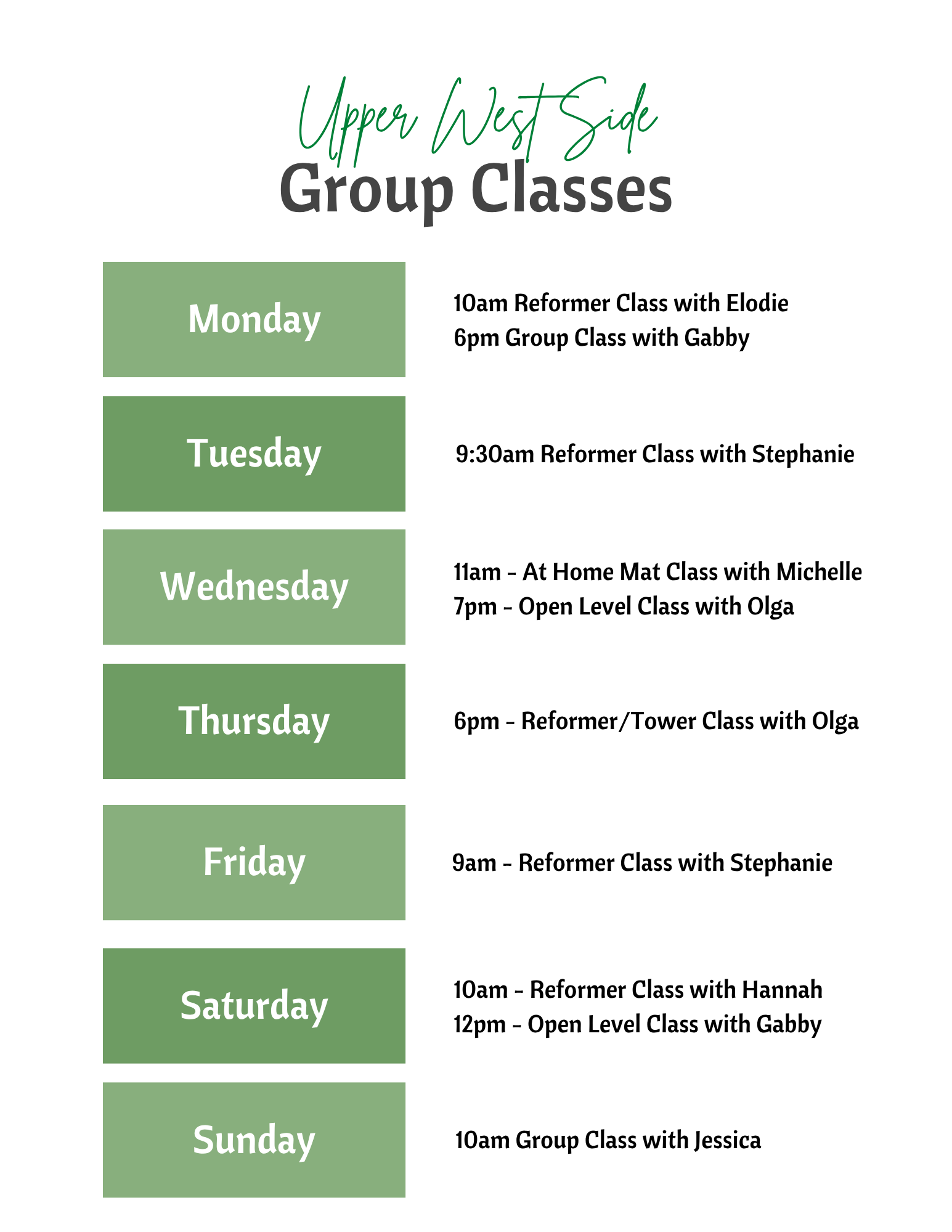 Join our dynamic group classes at Westside Pilates UWS, where expert instructors guide you through challenging, full-body workouts designed to strengthen, lengthen, and energize. Whether you're a beginner or an experienced mover, our intimate class sizes ensure personalized attention while fostering a supportive, community-driven environment.